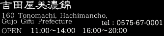 | Shi ShiNabe | Locally caught wild boar miso hot-pot, with local seasonal vegetables, winter pickles, steamed rice and dessert. (November - March only.) |